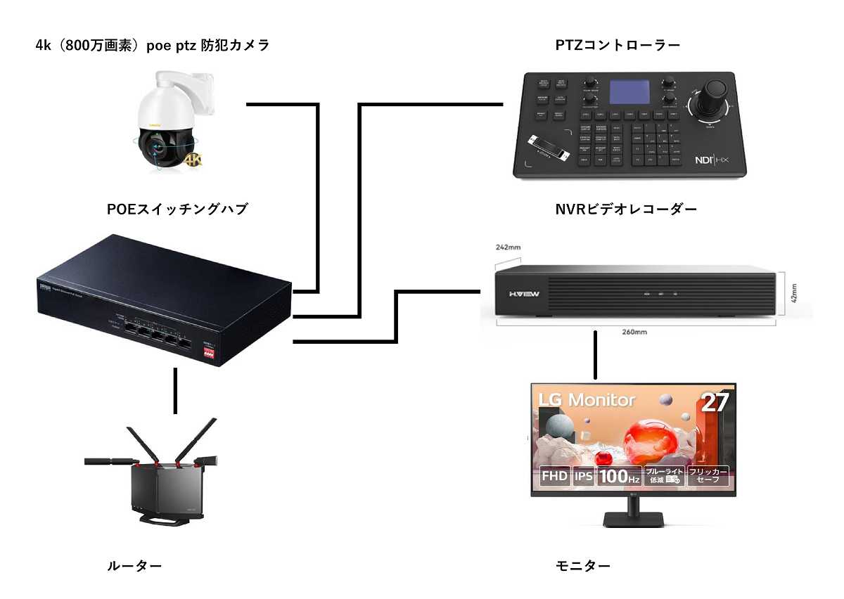 システム構築の注意点 1.防犯カメラの種類によって電力供給方法や映像伝送方法、録画機、が異なる為、事前に検討が必要 2.こちらは有線ネットワーク防犯カメラの為、POE対応LANケーブルでの接続となる。 3.カメラ、PTZコントローラー、NVRレコーダーはDHCP自動 IP接続後、固定IP設定が必要 4.スイッチングハブはPOE対応が必要となるが使用する電力量により注意が必要 スイッチングハブの種類 poe対応スイチングハブの規格名称は PoE(Power over Ethernet)に対応したスイッチングハブの規格名称は、主に IEEE 802.3af / 802.3at / 802.3bt という形で定められています。 具体的には: IEEE 802.3af(PoE) 最大供給電力:15.4W(受電側は最大約12.95W) IEEE 802.3at(PoE+) 最大供給電力:30W(受電側は最大約25.5W) IEEE 802.3bt(PoE++ / 4PPoE) Type 3:最大60W Type 4:最大90~100W つまり「PoE対応スイッチングハブ」といっても、対応している PoE規格(af / at / bt) によって供給できる電力量が異なります。 👉 ご利用の機器(例:IPカメラ、Wi-Fiアクセスポイント、IP電話など)が どのPoE規格まで必要か によって、選ぶべきスイッチングハブの規格も変わる。 カメラ、PTZコントローラー、NVRレコーダーは日本製でないので慣れていないと手間取ってしまう。 失敗談 1.NVRビデオレコーダーを購入時POE対応と明記されていたので購入した。しかしカメラとの相性が悪くLAN端子に直接カメラを接続すると不安定でした。 2POE対応スイッチングハブを購入したが電力不足で夜になるとカメラが誤動作を起こす。そこでPOE+を購入し解決した。 3.機器の設定をDHCPのままで使用したら時々接続が切れる。固定IP設定で解決 初めての為、試行錯誤でどうにか完了 |