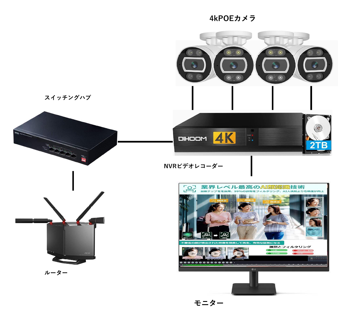 こちらの商品は必要なものは全て揃っている。 nvrレコーダーのLAN端子(POE)に付属のLANケーブル(POE)を接続しカメラをつけるだけするだけ |