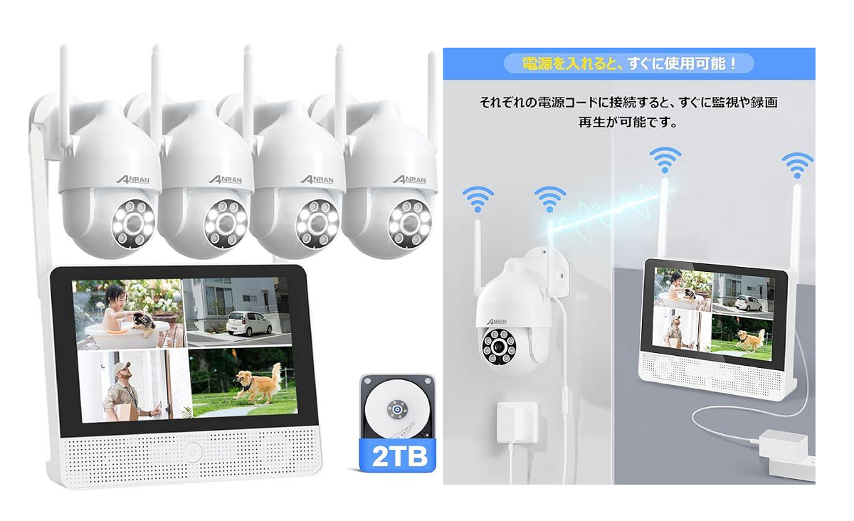| 【2025最新システム・500万高画素・360°自動追尾・2TB HDD内蔵】 ANRAN 防犯カメラ 4台セット 24時間常時録画 工事不要 10.5インチ一体型録画機 4台500万常時録画防犯カメラ 8台まで増設可 初期設定不要 遠隔監視 双方向通話 360°広角撮影 夜間カラー撮影 AI動体検知 家庭用wifi監視カメラセット IP66防水防塵 |